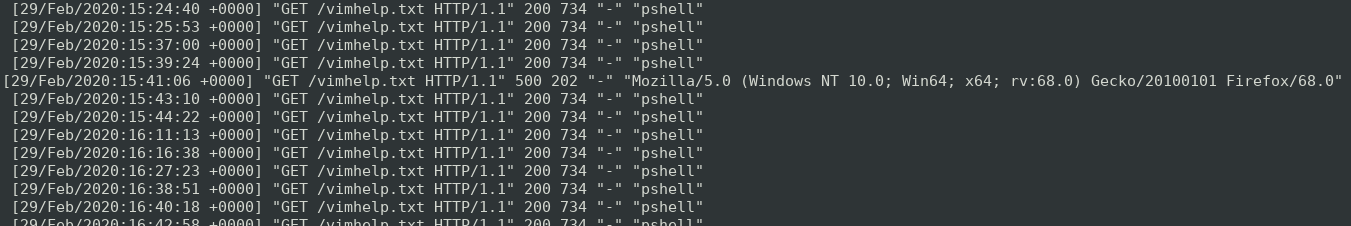 The total amount of requests made for the vimhelp.txt file by the end of the competition was just 319. I assumed this number would be far greater. Perhaps, there were more Emacs users than I anticipated or Blue Teams caught this early and removed it. Then I found another Blue Team that was deploying custom tools that amongst other things overwrote Vim. I won’t go into detail about what this team did with their binary as it appears they spent some time on it, and for all I know could be used in another competition. I will say they gave me some unique ideas for next year :) .