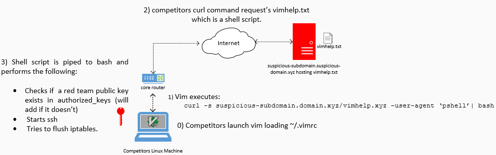 Blue Teams are actively monitoring, triaging and trying to kick the red team out of their machines. Persistence is key to these competitions due to the scrutiny students are putting their machines under. With this comes creativity of deploying non-standard persistence mechanisms, such as modifying the .vimrc configuration file.